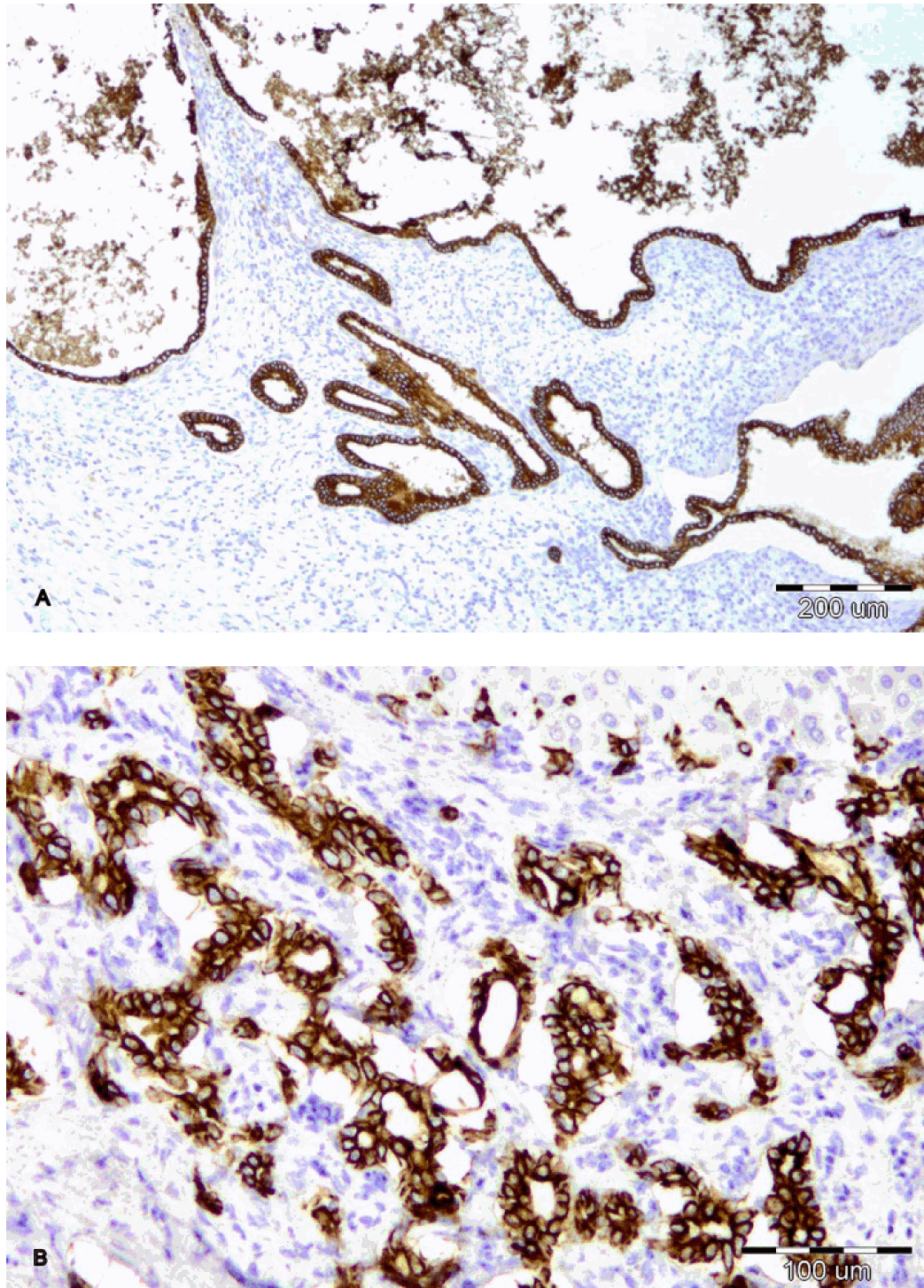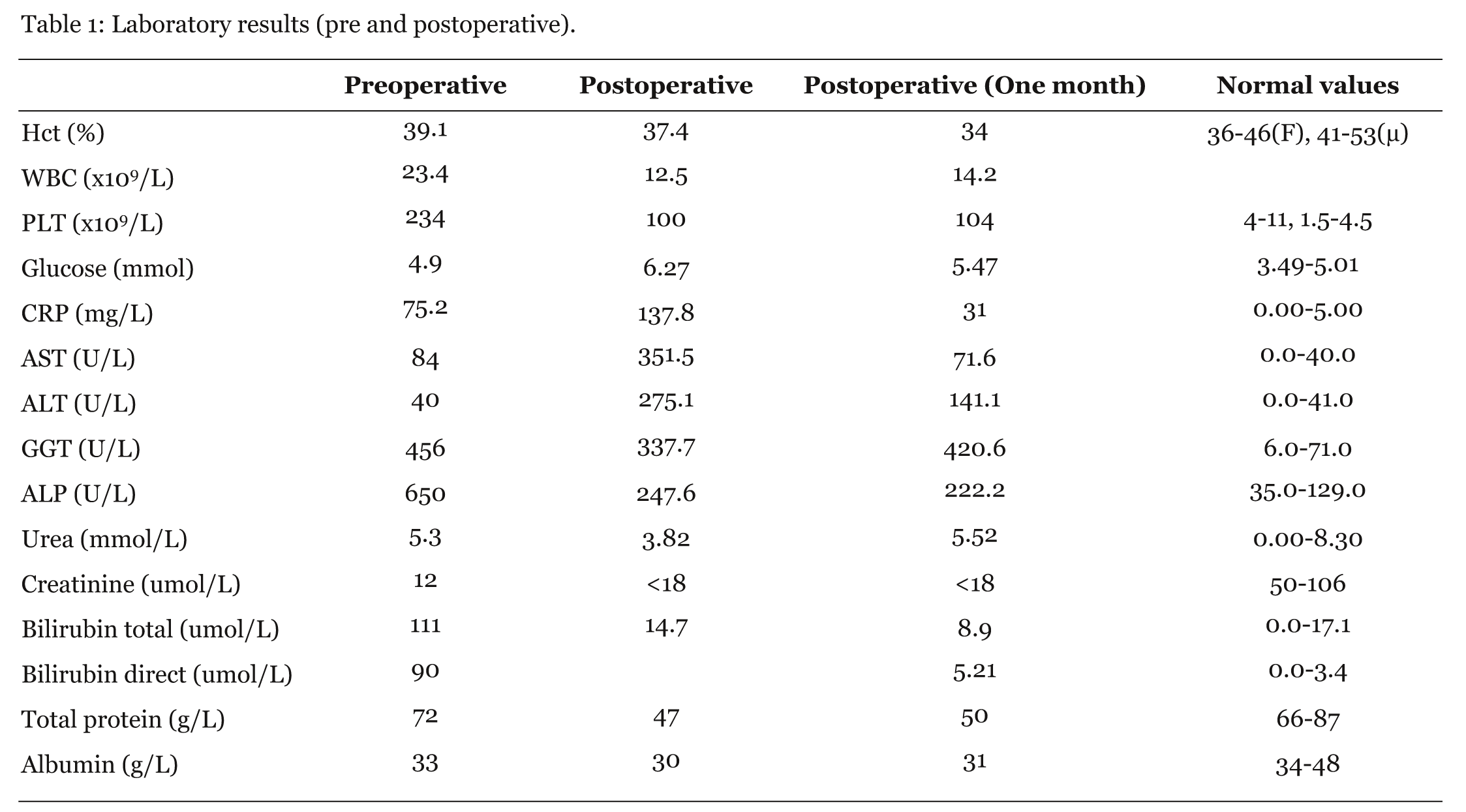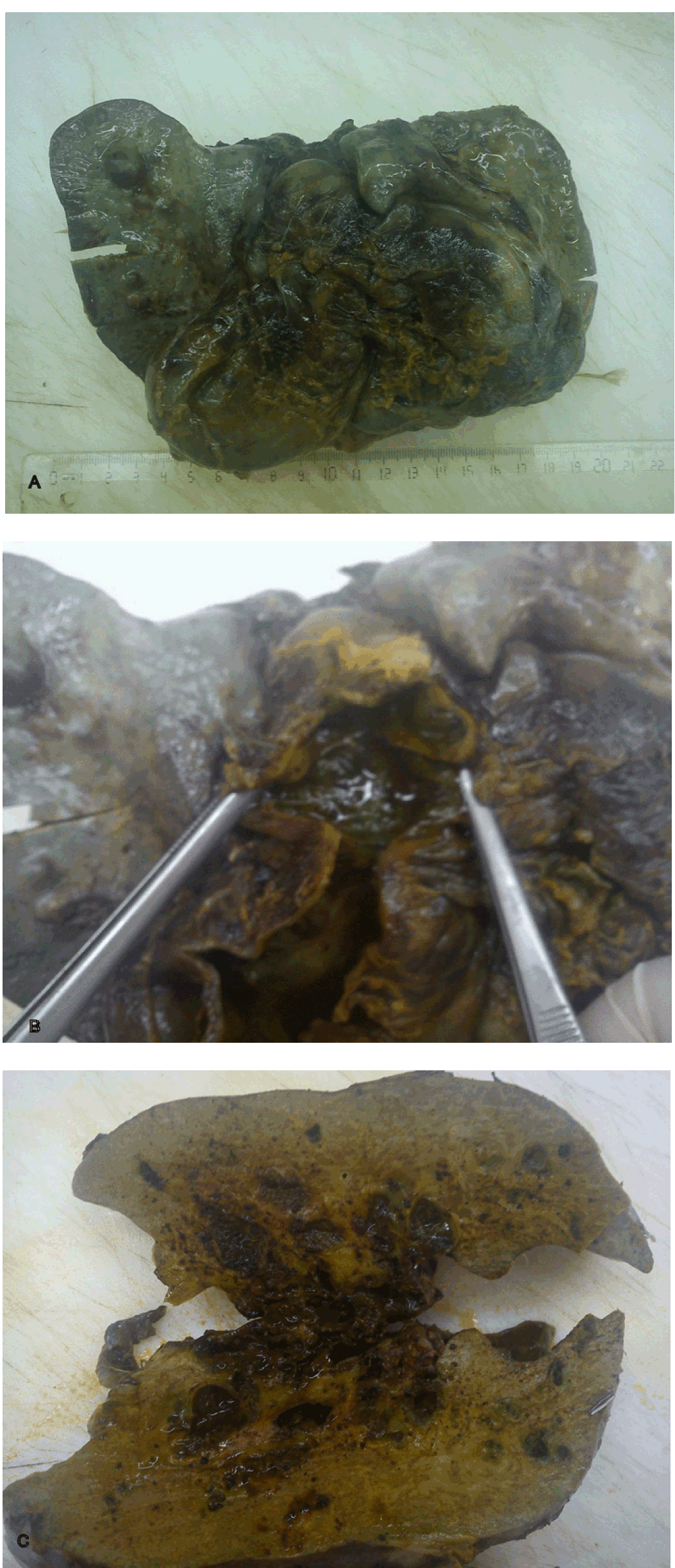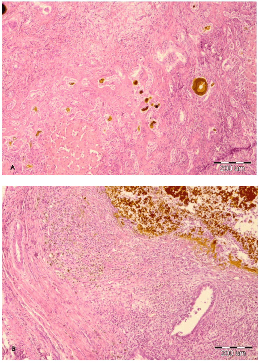 A three month old boy was admitted at Gastrenterohepatology Department of University Children's Hospital because of cholestatic jaundice. He was born at 41 weeks of gestation from controlled pregnancy with a birth weight of 3380 gm and jaundice. Laboratory results showed elevated conjugated bilirubin - 139 µmol/l, total bilirubin - 168 µmol/l, elevated serum AST (range from 192 - 278 U/l), ALT (range from to 116 - 122 U/l), elevated ?GT level (range from 457 - 584 U/l), proteins - 48 gm/l, albumin - 22 gm/l, normal a1-antytripsine - 1.49 g/l, normal serum iron - 20 µmol/l, a fetoprotein - 6567 IU/ml. All serological markers for viral hepatitis and antibodies for TORCH infections were negative. Metabolic screening tests for inborn errors of metabolism (aminoacidemia and organic aciduria) were normal. Tc - 99m iminodiacetic acid scan (HIDA) showed normal uptake by the hepatocytes, after two hours with no activity in the gut. Images taken after three hours and 24 hours showed radioisotope activity in the intestines, consistent with delayed and impaired bile excretion. MRI cholangiopancreatography revealed hepatomegaly with presence of fibrosis around intrahepatic bile ducts in both liver lobes. Extrahepatic bile ducts were not visible except the upper part of common hepatic duct, finding consistent with biliary atresia. Ultrasound examination of abdomen showed hapatomegaly and absent gallbladder. The ultrasound of urinary tract, heart and central nervous system excluded any congenital anomalies of these systems. Liver biopsy showed hyperplastic bile ducts, periportal fibrosis and cholestasis leading to the diagnosis of biliary cirrhosis. After one month the child was admitted to the University Clinic of Pediatric surgery for operative treatment but only open liver biopsy was performed. Microscopic examination of the liver tissue confirmed the findings from the first biopsy with additional features of necrosis and inflammation. After one month, at the Emergency Department the child presented with ascites, hepatomegaly (+5 cm under costal margins), sepsis and pale stools. For further examination and treatment the child was hospitalized again at University Clinic of Pediatric surgery where the living donor liver transplantation (LDLT) was made (first procedure for children in our country). The donor was the mother. During the donor operation left liver lobe (II and III segment) was dissected preserving the main vessels from the systemic and portal circulation and the main branches of the biliary tree. Than a hepatectomy was performed and the donor's liver segments were put in place anastomosing donor's hepatic veins with recipient's inferior vena cava. Portal vein was anastomosed termino-terminalis and hepatic artery to proper hepatic artery termino-terminalis. The donor's biliary duct was anastomosed to recipient's small intestine by Roux-en-Y loop. The liver from the hepatectomy (patient) weighed 650 gm and had nodular, green surface. Hilar bile ducts and the gallbladder were ectatic, gallbladder measuring 11x8 cm. Dissected liver tissue showed diffuse multiple cystic intrahepatal bile ducts with lithiasis (figure 1 A, B). Histopathologic analysis revealed intensive portal fibrosis, numerous ductal plate remnants, hyperplastic and dilated bile ducts with cholestasis and foci of microabscesses (figures 1-3). The diagnosis of Caroli's syndrome was made. Preoperative and postoperative laboratory results are shown in table 1. The child had two attacks of acute rejection but resolved with immunosuppressants with Prograf (tacrolimus), Cellcept (mycophenolate), mofetil, Soludecortin, Simulect (rapamycine); treated at University Clinic of anesthesiology, reanimation and intensive care. At nine months of age the child died and postmortem examination revealed biliary complications, multiple hepatal graft necrotic areas and sepsis. | ||||||