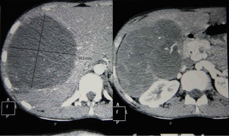 A 16-year-old boy with body weight of 26 kg was presented to us with a mass in the right hypochondrium since one month with history of abdominal pain, fever with chills and rigors. He had no history of jaundice, weight loss or loss of appetite. On elaborating the history, the mass was present for the last one month and rapidly increased for the last one week with severe intolerable pain last four days. On clinical examination, abdomen was soft and minimal guarding was present. A firm tender hepatomegaly was present 6 cm below right costal margin. Surface found to be smooth and edges were rounded. Contrast-enhanced computed tomography scan of abdomen revealed 15x11x9 cm heterogeneous multi-septated lobulated mass lesion involving right lobe of liver involving the segments 5, 6, 7, 8 (Figure 1) and (Figure 2). Portal venous Doppler study showed displaced and stretched right portal vein with normal flow. Laboratory investigations at the time of admission showed hemoglobin 8 g/dL, platelets 4 lakhs/mm3, blood sugar 80 mg/dL, blood urea 22 mg/dL and serum creatinine 0.8 mg/dL. Two units of packed cells were transfused and the preoperative hemoglobin was 10 mg/dl. Tumor markers AFP and CA 19-9 were done. Alpha fetoprotein value was 4 ng/mL and CA 19–9 was found to 20 U/mL. Liver biopsy was not taken to avoid the risk of seedling of an operable tumor.