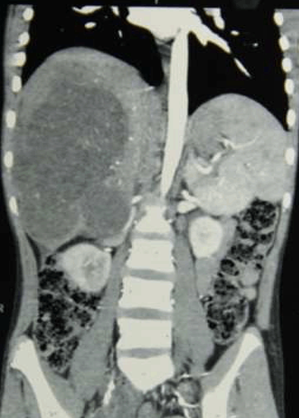 Figure 2: Coronal view of contrast-enhanced computed tomography scan of abdomen showing the lesion occupying the entire right lobe.