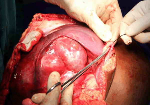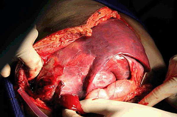Figure 4: Rhabdomyosarcoma, during surgery, tying the Falciparum ligament.