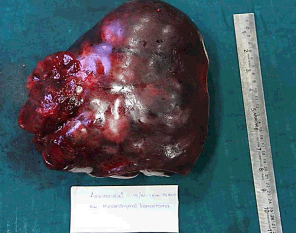 Case Report: A 16-year-old boy, with weight of 26 kg, presented to us with sudden onset of abdominal pain and fever. Clinical examination revealed a tender hepatomegaly about 6 cm below right costal margin. Contrast-enhanced computed tomography scan of abdomen revealed 15x11x9 cm heterogenous multi-septated loculated mass lesion involving right lobe of liver involving segments 5, 6, 7, 8. Diagnostic laparoscopy showed a tumor occupying the entire right lobe of liver with no other deposits. The tumor capsule was seen ruptured on the right lateral side for which we did emergency right hepatectomy. Weight of the specimen was 2.8 kg. Histopathology revealed the lesion as embryonal rhabdomyosarcoma with co-existing mesenchymal hamartoma. Immunohistochemistry showed Vimentin and Desmin positive. Patient was on carboplatin and Ifosfamide chemotherapy. Patient expired on 30th postoperative day due to acute respiratory distress.