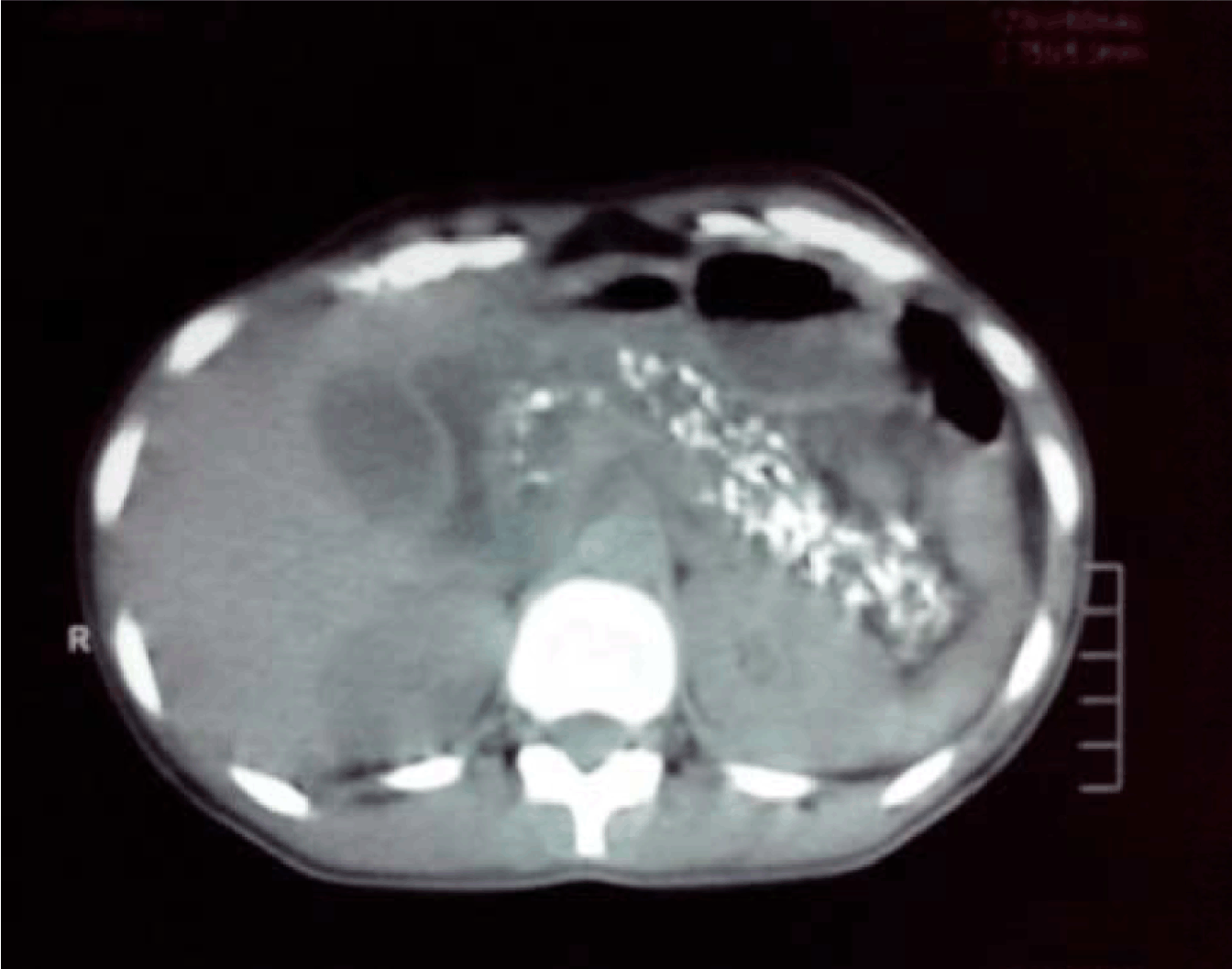 Figure 3: CECT abdomen showing diffuse calcification in head and body.