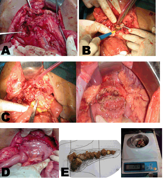 A total of 80 patients were analyzed. Of them 60 were male and 20 were female. The age of the patients varies between 13 to 58 years. The mean age and SD is 37 +10.4 years (Figure 1). Regarding the etiology of chronic calcific pancreatitis, alcohol was associated in 58 patients and 22 patients were considered to be tropical calcific pancreatitis. (Table 1). Of the various complications in this group (Figure 2): Ten presented with diabetes mellitus, six presented with exocrine insufficiency, splenic vein thrombosis with fundal varices was seen in three patients. Pseudocyst in the tail of the pancreas was seen in seven patients. Pancreatic ascites was present in three patients and only two of them without head mass presented with jaundice. All the patients underwent CECT scan to look for calcifications and head mass (Figure 3). MRCP was done in two patients who presented with jaundice (Wadsworth syndrome) both of them had a tapering end of the distal CBD in the absence of head mass (Figure 4). Upper gastrointestinal endoscopy and portal venous Doppler was done for all patients. Only three patients who had splenic vein thrombosis on portal vein Doppler had fundal varices on endoscopy and diagnosed as sinistral portal hypertension. All the patients underwent Frey procedure as already described, amount of tissue cored was measured in grams. Average tissue coring done in the 80 patients is 3.8 grams (Figure 5A-E).