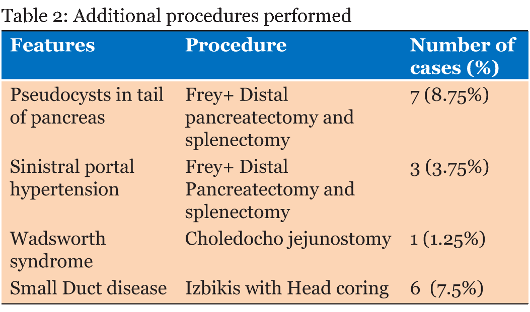 Additional procedures like distal pancreatectomy with splenectomy was done in 10 patients- three patients who had sinistral portal hypertension, seven patients who had pseudocyst in tail of pancreas. Six patients who had small duct disease underwent Izbikis 'V' shaped opening of the duct along with head coring. For the two patients who had jaundice choledocho jejunostomy was done in one patient and the other patient had relief of jaundice after coring (Table 2). All the other patients underwent single layered mucosa to mucosa pancreaticojejunostomy using 3'0 polypropylene continuous sutures (Figure 5C-D)