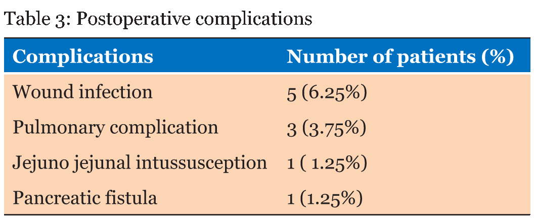 No patient had major intraoperative complications. Mean blood loss is 150 mL. Mean duration of surgery is three and half hours. There was no 30-day mortality. In this series, significant complications occurred in 10 patients. It included three with pulmonary complications, five with wound infection, one had gastric outlet obstruction due to jejunojejunal intussusception which was managed by laparotomy and one had pancreatic leak which settled after two months by conservative management (Table 3). The pulmonary complications that were mentioned include two patients with left lung basal atelectasis and one patient with aspiration pneumonia. Atelectasis was treated with intravenous deriphyllin, nebulization with bronchodilators and chest physiotherapy. Aspiration pneumonitis was treated with Antibiotics and bronchodilators. Wound infection cases underwent pus culture and sensitivity and appropriate antibiotics were added based on the antibiotic sensitivity. Four cases had Staphylococcus aureus positive in the culture test and one patient had E. coli and Kliebsiella grown in culture. One patient had jejunojejunal intussusception at the jejunojejunostomy site of anastomosis. The jejunojejunostomy was done in that case in an end to side fashion. The patient presented to us with history of pain abdomen and vomiting after two months of surgery. When we did Gastrografin study, we found that there is cut-off at the level of upper jejunum with distension of stomach. The CECT scan of abdomen showed the presence of intussusception. For that patient, we did relaparotomy and did disconnection of jejunojejunostomy. A new anastomosis was done in a side to side fashion between the pancreatic limb of the jejunum and afferent limb of jejunum. Biopsy of the cored tissue obtained in all cases. Biopsy report, came as chronic pancreatitis, of only one patient showed evidence of malignancy, and the patient was referred to medical oncology for Gemcitabine based chemotherapy. The patient was under follow-up with us for six months. He did not develop any metastasis until six months. His CA19-9 level after six months was 10. All patients were followed-up for six months regularly in outpatient department and register was maintained about the pain score based on visual analogue scale (VAS) score, diabetic control (in terms of reduction in Hba1c and reduction in dose of insulin/OHA) or new onset diabetes, weight gain and about exocrine insufficiency.