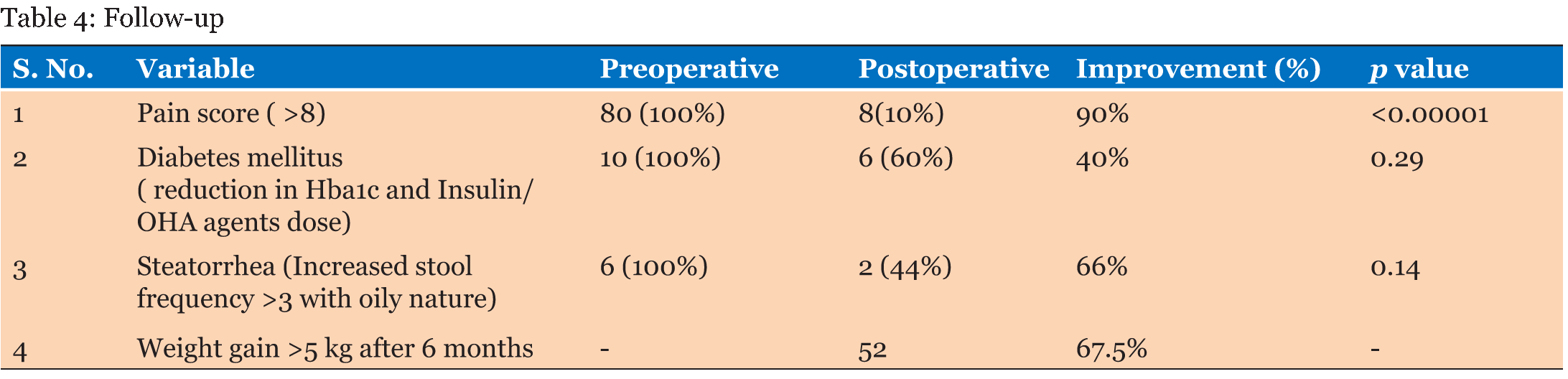 On follow-up for six months period, 72 (90%) had complete pain relief and 8 (10%) patients on follow-up found to have VAS score of 8. Coeliac plexus blockade was given in the follow-up period if they do not respond for analgesics for a period of two months. Only those patients who had retractable pain after two months of analgesics were selected for CECT guided coeliac plexus blockade. Of the eight patients, only six needed coeliac plexus blockade and two patients were comfortable with analgesics. Of the 10 patients with diabetes 4 (40%) of them improved in glycemic control with reduction of insulin dose and reduction in HBa1c after three months. Of the six patients with steatorrhea 4 (66%) had improvement of symptoms. No patient developed new diabetes or steatorrhea in the six-month follow-up period. About 54 patients (67.5%) developed a weight gain of more than 5 kg in six months (Table 4).