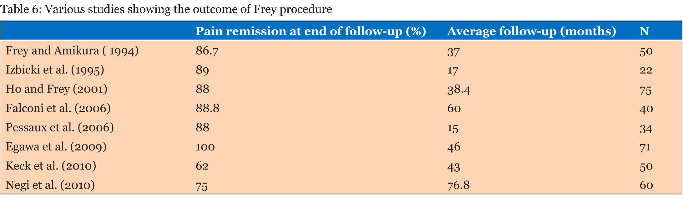 Results: There was no 30-day mortality. Statistical analysis showed significant improvement of pain score. The improvement of pain score in the patients without head mass is comparable to the patients with head mass for whom Frey procedure was done. Though there is improvement in endocrine and exocrine insufficiency they are not statistically significant as per chi-square test.