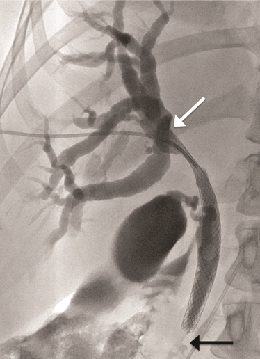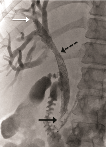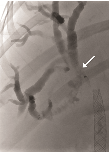 A 52-year-old female presented to her general physician with a four-month history of right upper quadrant discomfort and was referred for an outpatient abdominal ultrasound scan. This revealed intrahepatic duct dilatation and subsequent computed tomography (CT) scan of liver and magnetic resonance cholangiopancreatography (MRCP) confirmed imaging features of a 24-mm intrahepatic cholangiocarcinoma. This was located immediately proximal to the confluence of the left and right hepatic ducts and was causing obstruction of the left intrahepatic ducts. There were no distant metastases identified on imaging or staging laparoscopy. Endoscopic retrograde cholangiopancreatography (ERCP) and direct endoscopy of the bile duct was performed with the aim of directly visualizing the tumor to obtain a biopsy and confirm the diagnosis. Cannulation of the bile duct was difficult and a pre-cut sphincterotomy was performed in an attempt to facilitate access, but this was unsuccessful. The procedure was complicated by a duodenal perforation with retroperitoneal collection and pancreatitis, which delayed definitive management. The tumor was thought to be resectable after initial imaging, but unfortunately, repeat CT scan demonstrated progression over the subsequent weeks with involvement of the right portal vein and right intrahepatic ductal system. The patient was discharged two weeks after the ERCP, but re-presented to the emergency department a week later complaining of abdominal pain and nausea. At this time, she was noted to be clinically jaundiced. Fluoroscopically guided percutaneous trans-hepatic cholangiography (PTC) and bare metal stent insertion was therefore performed under conscious sedation as a palliative procedure to relieve the obstruction. Following puncture of the right anterior ducts with an introducer set ('Accustick' introducer set, Boston scientific®), complete occlusion of the ductal system was demonstrated. There was no cross filling of the left segmental ducts. The obstruction was traversed with a guide wire. A 10x70 mm USEMS (Placehit Biliary WALLSTENT, Boston Scientific®) was then deployed across the stricture and was positioned with 3 cm of stent proximal to the tumor to allow maximum proximal expansion within the duct and ensure optimal flow of bile from the intrahepatic ducts (Figure 1). Free flow of contrast into the common bile duct was demonstrated, indicating successful procedure and no balloon expansion was required. The day after the procedure, the patient complained of abdominal pain and nausea, and developed a temperature of 38.5°C. She was noted to be more jaundiced. Serum bilirubin rose from 84 mmol/L (normal range: 21–100 mmol/L) before the stent placement to 268 mmol/L two days post-procedure. Full blood count revealed elevated white cell count of 21x109/L (normal range: 4–11x109/L) and serum C-reactive protein (CRP) increased to 47 mg/L (normal range: 4–8 mg/L). A diagnosis of biliary sepsis was made. Blood cultures grew Enterococcus faecium with resistance to amoxicillin. Teicoplanin, gentamycin and metronidazole were commenced. The liver function tests failed to improve over the next few days, and a repeat PTC was performed eight days after the first procedure which demonstrated that the stent had slipped through the stricture into the extra-hepatic biliary tree, and that the right intrahepatic duct was once again completely occluded (Figure 2). A wire was placed across the occlusion and through the centre of the migrated stent, and a further uncovered 10x70 mm self-expandable metal stent (Placehit Biliary WALLSTENT, Boston Scientific®) was then placed across the stricture and deployed, the distal end of the new stent sited within the proximal end of the migrated one. There was some wasting in the region of the tumor which was dilated using a balloon dilatation catheter (35LP Low-Profile PTA Balloon Dilatation Catheter (0.35", 8 mm diameter 4 cm length). There was subsequent free flow of contrast into the duodenum indicating a successful procedure (Figure 3). Following the placement of the second stent, the patient improved with reduction in pain and nausea. Serum bilirubin dropped from 195 mml/L to 119 mmol/L within two days, and she was discharged four days later for outpatient oncology follow-up. |