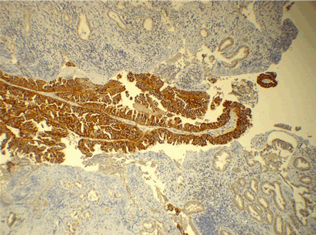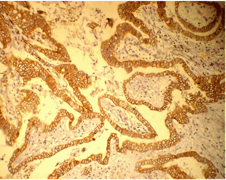 Gallbladder cancer is the most common cancer of the biliary tract and has a particularly high incidence in Chile, Japan, and Northern India. Its incidence steadily increases with age and women are affected two to six times more often than men [3]. High incidence of GBC in our region and its poor prognosis necessitates a closer look at the molecular changes for evolving an effective early diagnostic and therapeutic strategy. Expression of HER2/neu has been intensively studied in different tumor entities and has led to the use of targeted therapy with specific inhibitors or antibodies of these receptors in colorectal, breast, lung as well as head and neck cancer. Its expression as potential therapeutic targets has been reported in various tumors [6] [7] [8]. For biliary tract carcinoma, data for HER2/neu overexpression have been presented in mostly small patient cohorts. Its overexpression and amplification has been found in a range between 5% and 76% in biliary tract cancers [9] [10] [11] [12] [13]. Targeted therapy with the anti-HER2/neu antibody in breast cancer is effective when the HER2/neu receptor is overexpressed [5]. However, its study in gallbladder carcinoma is limited. In the present study, histopathological examination of 54 gallbladder carcinoma cases was done in our institute and it was correlated with Her2/neu IHC staining. The youngest patient in our study was 27 years and the oldest was 86 years. To the best of our knowledge, the youngest patient of carcinoma gallbladder reported in literature is a 15-year-old girl reported by Khandelwal et al. in their study of 150 cases of GBC [15]. The mean age of presentation in our series was 57.31 years. The maximum numbers of patients were in the seventh decade (33.33 %) followed by fifth decade (29.3%). The association between cholelithiasis and gallbladder cancer has been known since 1861. However, it is seen that only 0.5–1% of cases with gallstone disease develop carcinoma of gallbladder [16] [17]. In the study by Mohan et al. 1% of cholecystectomies performed for cholelithiasis showed early carcinoma [18]. We found 2.9% of gallbladder cancer out of a total of 1851 cholecystectomies, out of which 22 (1.1%) were incidental carcinoma. In our study, 26 patients (48 %) of gallbladder cancer had calculi in the gallbladder. Fifty-three of our cases (98%) were adenocarcinoma and one case (2%) was adenosquamous carcinoma. Levin et al. [19] and Rajagopalan et al. [20] reported over 85–90% of gallbladder carcinoma histologically as adenocarcinoma in their studies. Twenty-two cases (41%) in our study were diagnosed incidentally. Out of which seven cases (32%) were in stage T1, twelve cases (55%) in stage T2 and three cases (13%) were in stage T3. On the other hand, out of 32 previously diagnosed cases of gallbladder carcinoma, 24 cases (75%) were in stage T2 and four cases (12.5%) each in stage T1 and T3. It reflects the fact that most of the cases diagnosed incidentally are in the early stages of cancer (T1). Shih et al. reported incidentally discovered GBC during cholecystectomy in 53 patients out of 107 patients of GBC (50%) at Johns Hopkins Hospital in a 10-year study period [21]. They concluded that patients who were found to have gallbladder carcinoma incidentally during cholecystectomy had a significant increase in survival when compared with those who were admitted electively with a known diagnosis. In our study, 36 (66.66%) of the cases were in stage T2; eleven (20.37%) in stage T1, and seven (13%) in stage T3. Memon et al. reported 61% gallbladder cancers in clinical stage IV, 22% in stage III and 17% in stage II at the time of presentation [22]. Her2/neu was strongly positive in five cases (9.25%) of gallbladder cancer in our study, out of which four were moderately differentiated adenocarcinoma and one was poorly differentiated adenocarcinoma. This finding was in accordance with the findings of Puhalla et al. who found expression of HER2/neu in 13% of the patients of GBC with IHC staining [23]. Similar IHC pattern was seen between the tumor cells and dysplastic cells. Adjacent normal mucosa was negative for Her2/neu staining in all except one case in our study. Kawamoto et al. reported positive overexpression of Her2/neu in GBC in 31.2% of specimens by IHC method [9]. Only few studies of overexpression of Her2/neu in gallbladder cancer have been reported from India. Chaube et al. investigated the role of Her2/neu in the carcinogenesis of gallbladder by IHC and found 25% of cases positive for Her2/neu expression [24]. In their study, positivity decreased with increasing grade of gallbladder carcinoma. They have concluded that decreasing over expression of c-erbB-2 with increasing grade suggest that c-erbB-2 is likely to play a lesser role in tumor progression. In our study we did not find any such correlation. However, there seems to be some correlation of IHC staining pattern and tumor stage. There were 11 cases in stage T1, 36 cases in stage T2 and 7 cases in T3 stage. Out of these case 3+ positivity was shown by 2 cases (28.57%) in stage T3; three cases (8.33%) in stage T2 and none in stage T1. Hence the frequency of Her2/neu positive cases was highest in advanced stage (p = 0.042). Study with larger number of cases is required to further substantiate this finding. In our study, one case each of well differentiated and a poorly differentiated tumor, showed sharply defined 3+ positivity adjacent to 1+ positive area. Also there were few cases in which focal 2+ positive areas were present adjacent to predominant 1+ positive area. This suggests that even in a single case of GBC, different staining patterns of Her2/neu can be seen which highlights the importance of adequate sampling of the tumor for Her2/neu immunostaining. To the best of our knowledge, such a heterogeneous pattern of immunostaining of Her2/neu has never been reported in literature prior to this study. Also equivocal IHC staining (2+) cases are an important p