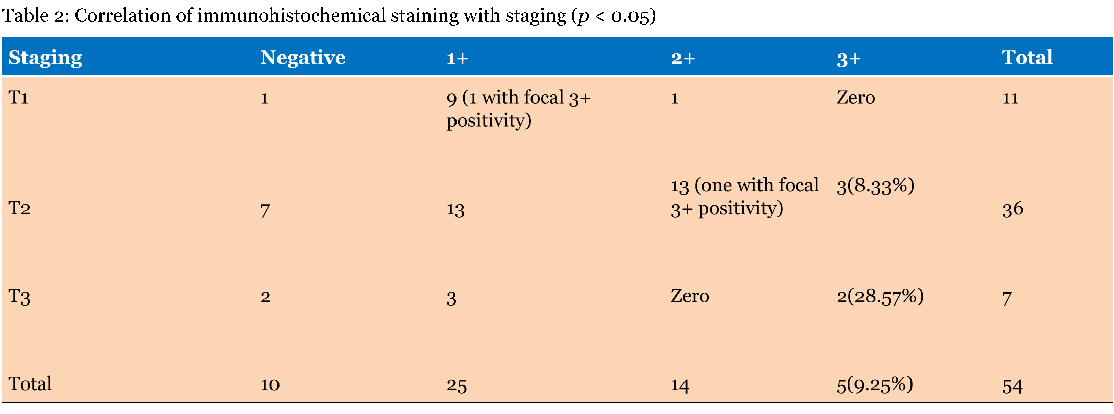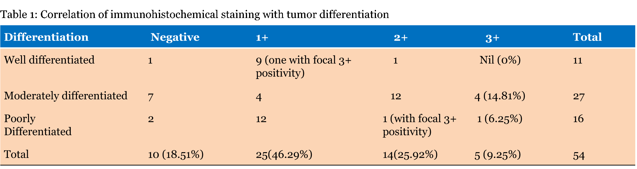 Material comprised of resected specimens of carcinoma gallbladder examined in the Department of Pathology, Sir Ganga Ram Hospital, New Delhi (India) from January 2007 to July 2011. This study included both retrospective as well as prospective components. The study comprised of 54 cases of GBC found during this period out of 1851 cholecystectomy specimen. A gross evaluation of tumor was done in the resected specimens. After the preliminary study of all Hematoxylin and Eosin stained sections, IHC staining was done for Her2/neu in malignant tumor along with non-tumorous area. The relative frequency of Her2/neu positivity was scored and correlated with other histological prognostic parameters of the tumor. Areas that were not involved by the tumor were also studied for Her2/neu and external positive and negative controls were put while performing IHC staining in each batch. Controls were taken from the known cases of the breast specimen. Her2/neu was graded as per criteria defined by the American Society of Clinical Oncology and the College of American Pathologists [14]. The data thus collected was compiled and analyzed using SPSS version 21 for Mac (IBM Corporation, 2012). Qualitative variables were expressed as proportions in percentages. The association between variables was calculated for 95% confidence intervals by using "chi square test". A p-value < 0.05 was taken as significant. For quantitative data, mean and standard deviation was calculated. An approval for this study was obtained from the Institutional Ethical Committee. | ||||||