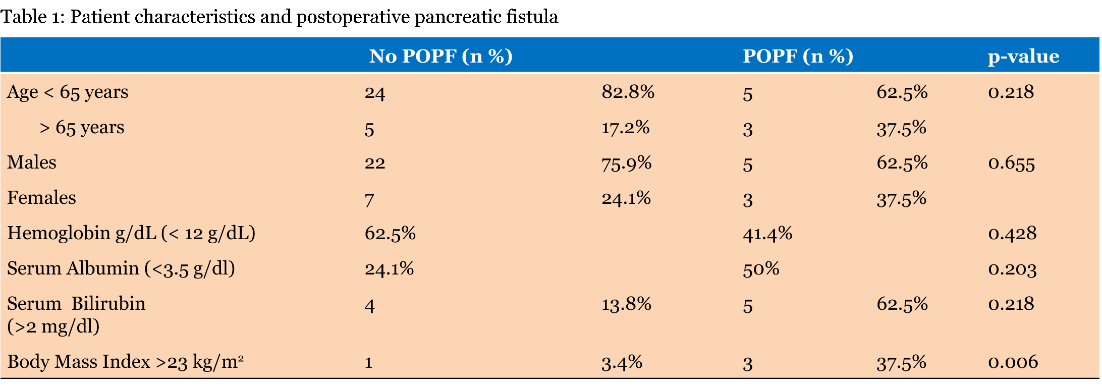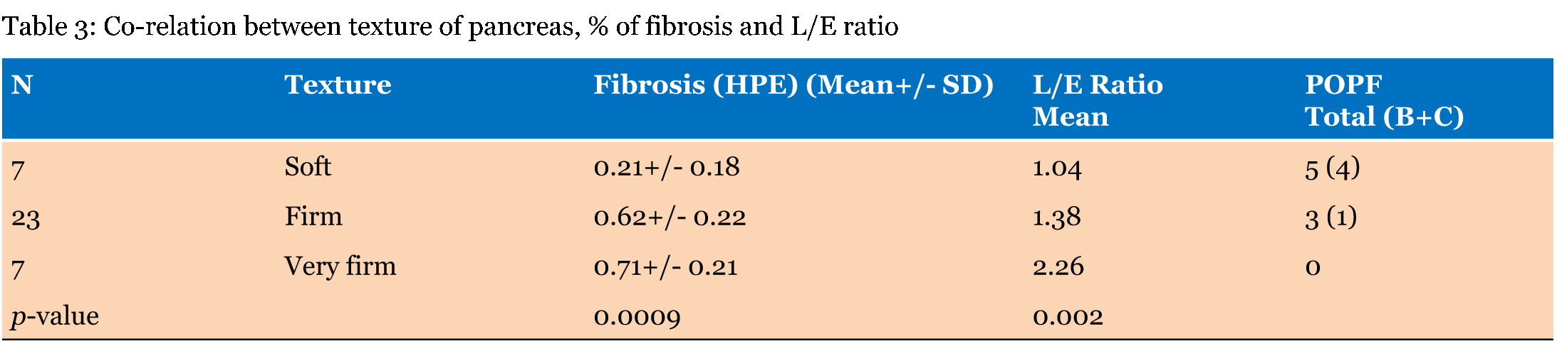 Forty-three eligible patients presented to us. Six patients who underwent Pancreatoduodenectomy were excluded from the study due to inability to perform a CT scan in accordance with the pancreatic protocol due to various reasons, (Contrast hypersensitivity in 3, renal function compromise in 2 and unwilling to undergo a repeat CT scan as per pancreatic protocol in 1 patient) A total of 37 patients who underwent Pancreaticojejunostomy were included in the present study (Figure 1). The age group ranged from 16 to 70 years for patients suffering from chronic pancreatitis (median age 41 years). patients with suspected malignancies ranged from 45 to 70 years of age with a (median of 57.5 years). All patients underwent a preoperative contrast enhanced CT scan with Pancreatic protocol (Figure 2). Hemoglobin less than 12 g/dL was considered as anemia [8]. A mean hemoglobin was 12.26 g/dL in the study group with a median of 12.05 g/dL (Range 7.9 to16.5 g/dL) 45.95% of patients suffered from anemia in the study group. Elevated bilirubin levels were detected in nine patients. Eight of these patients were diagnosed with malignancies (Total bilirubin range 8.5–26.5 mg/dL, mean 15.58 mg/dl). One patient with chronic pancreatitis with CBD stricture had a total bilirubin of 3.0 mg/dl. Eleven patients had albumin levels less than 3.5 g/dl (range 1.2–3.4 g/dl). The BMI was calculated for all patients. A normal BMI for Indians is between 18.5 and 23. Nineteen patients had a BMI less than 18.5 (51.4%). Of these, six patients (31.57%) suffered from malignancy, one patient (5.2%) had adenomyomatous hyperplasia of distal CBD and 12 (63.15%) suffered from chronic pancreatitis. Four patients had a BMI of > 23 (10.8%). Three patients (75%) had malignancy and 1 patient (25%) had CP. No significant association was seen between patient characteristics or preoperative investigations and risk of POPF except for an elevated BMI which showed significant association with POPF (Table 1). MORBIDITY MORTALITY A significant number of leaks, i.e., 5 (62.5%) out of 8 leaks occurred in patients with malignancy though this value did not attain statistical significance (p-value 0.067). However, it was found that four out of five patients (80%) with a clinically significant leak (ISGPF grade B/C) were suffering from malignancy (p-value 0.024). Patients with chronic pancreatitis were less susceptible to leak with only three leaks out of eight occurring in these patients. Moreover, only one clinically significant leak occurred in these patients (p-value 0.144). Computed tomography FINDINGS The L/E ratio, described earlier, was tested for association with POPF. Analysis revealed that a L/E ratio less than or equal to 1 was present in six out of eight patients with leak (p-value 0.001). Furthermore, all five patients (100%) with grade B and C leaks had a L/E ratio less than or equal to 1 (p-value of 0.0003, Fisher's exact test). A mean L/E ratio of 0.98 had a sensitivity and specificity of 75% and 93.1% respectively for predicting the occurrence of a leak [3]. In five out of eight patients with leak (62.5%) and 4 out of five patients (80%) with a clinically significant leak, the consistency of the pancreas was deemed to be soft by the surgeon. The p-value on Pearson chi-square test was 0.001. The L/E ratio also co-related with the surgeon's assessment of the pancreatic texture. The mean L/E ratio was 1.04 for soft pancreas, (p-value- 0.001) (Table 3). HPE and POPF The L/E ratio in our study showed excellent co-relation with the degree of pancreatic fibrosis. A mean L/E ratio of 1.48 with a SD of 0.69 showed statistically significant association with a fibrosis of 56% with a p-value 0.002 (Figure 5). The L/E ratio also co-related with the surgeon's assessment of the pancreatic texture. The mean L/E ratio was 1.04 for soft pancreas, 1.38 for firm and 2.26 for very firm pancreas, (p-value 0.001). Table 3 shows the co-relation between the texture of the pancreas, degree of fibrosis and the mean L/E ratio among the cohort. | ||||||