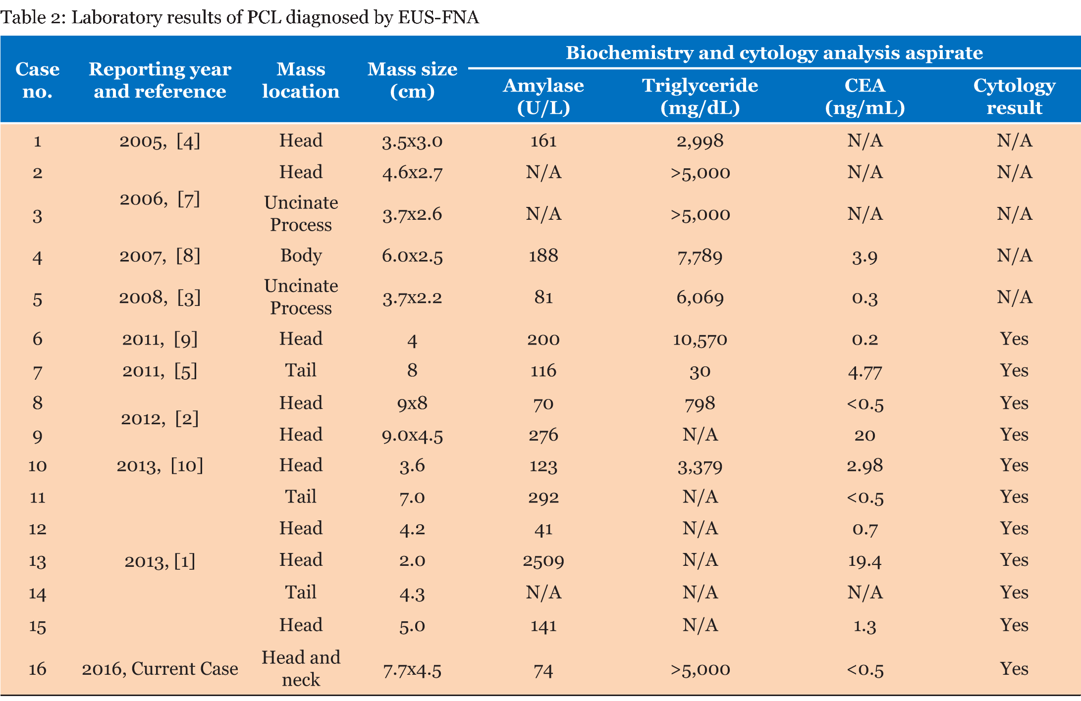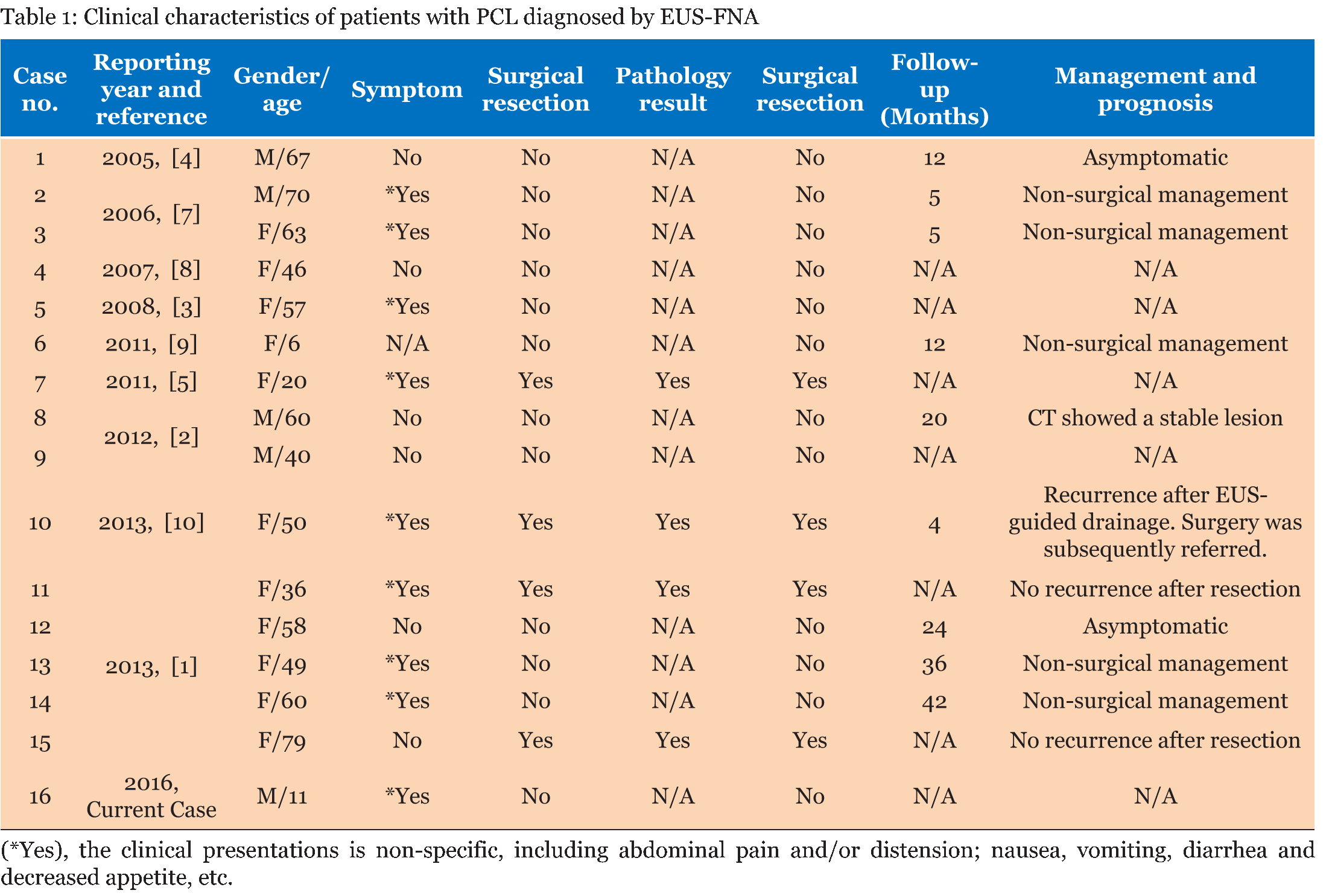 Distinguishing mucinous from non-mucinous cystic lesions of the pancreas often constitutes a diagnostic dilemma. The clinical management differs between such lesions. Therefore, it is important to make an accurate preoperative diagnosis. EUS-FNA has emerged as an extremely useful modality in the diagnosis and management of cystic lesions of the panaceas, in particular the growing role in evaluating uncommon cystic lesions such as PCL [6]. On a review of published English literature, we found around 60 case reports on PCLs based on surgical pathology, while recent reports including this one, together 16 cases, have appropriately demonstrated the usefulness of EUS-FNA in the evaluation of this rare lesion (Table 1) and (Table 2) [1][2][3][4][5] [7][8][9][10]. Pancreatic cystic lymphangioma originates from congenital malformations of the lymphatics, such as the proliferation and dilatation of blind ended lymphatic sacs which lack proper connections with the venous system that occur within the pancreatic parenchyma or peripancreatic soft tissue [1] [11]. The theory of a congenital aetiology may suggest most cases should be present in childhood. Other potential causes are thought to include, abdominal trauma, localized lymphatic degeneration and lymphatic obstruction. Nevertheless, the collected series suggested PCL found in middle-aged, asymptomatic women [1] [12]. For patients initially diagnosed with EUS-FNA, we found the age ranged from 6 to 79 years, with a mean of 47.6 years (Table 1). Female-to-male ratio is 14:2, in which does seem to be a true predilection for females. Pancreatic cystic lymphangioma consists of interconnecting cysts that are separated by septa and contain serous serosanguineous and chylous fluid [1]. Histologically, the cysts are lined by benign-appearing endothelial cells that react with anti-CD31 and anti-factor VIII-R Ag antibodies, but usually negative for CD34, a human progenitor cell antigen. Furthermore, Edina et al. showed the septa between lymphatic spaces were immunoreactive for alpha-smooth muscle actin (alpha-SMA), a marker for myofibroblasts [12]. The role of EUS-FNA in the evaluation of uncommon cystic lesions such as PCL has been less clear. Our search of recent reports, including this one, supports EUS-FNA provides the gross, biochemical and cytological features in examining PCL. Grossly, no cyst fluid was thick or viscous, indicating not a mucinous cyst. Most of aspirated cyst fluids were reminiscent of chylous fluids described as milky due to the high triglyceride content (Table 2). Although another two cases showed serous fluid, further special stains for mucin were negative, but yet the fluid analysis may not lead to a definitive diagnosis [1] [5]. Thus when the fluid is grossly chylous and the triglyceride level is significantly elevated, as in this case, the diagnosis of a pancreatic cystic lymphangioma can be made with confidence. For biochemical analyses of often paucicellular cyst aspirates, tumor markers as well as enzyme markers are now routinely performed to aide in the diagnosis, in which help distinguish non-mucinous cysts, such as pseudocyst and serous cystadenoma, from mucinous cysts, mucinous cystic neoplasm and IPMN [13] [14]. For example, a cut-off of CEA levels ≥192–200 ng/mL is approximately 80% accurate for the diagnosis of a mucinous cyst [15]. In addition, amylase levels elevated to the thousands are almost universally suggestive to pseudocysts. Consistently, those PCL cases reviewed from literature showed low CEA (<20 ng/mL) and amylase levels ranged from 41–276 U/L, except one case just over 2000U/L, which is equivocal but still rather low for a pseudocyst [1]. Cytological analysis of cyst fluid provided the final piece of data to support the diagnosis of lymphangioma. In literature (Table 1) and (Table 2), 11 cases provide cytology that revealed rich population of small, mature lymphocytes and in addition, macrophages and benign epithelial cells were seen in a few cases [2] [4]. It has been suggested that such a rich population of lymphocytes is not a feature of serous or mucinous cysts [16]. Although lymphocytes may be seen in pseudocysts and lymphoepithelial cysts, other characteristics of the cyst fluids in both of these cystic lesions separate them from lymphangioma [17][18]. For instance, pseudocyst fluid is generally brown or bloody and filled with histiocytes and mixed inflammatory cells with a proteinaceous background. Lymphoepithelial cysts have a characteristic combination of anucleated and nucleated squamous cells and keratinous debris with small mature lymphocytes. Furthermore, sampling the collapsed walls of the cyst with the FNA needle may also increase the diagnostic yield [5]. Pancreatic cystic lymphangioma is not considered premalignant lesions, and consequently, expectant management with clinical follow-up and surveillance imaging has been proposed as a reasonable approach, especially in asymptomatic patients. Our search of literature showed 11 out of 15 diagnosed with EUS-FNA underwent nonsurgical management (Table 1). For those subsequently had been followed, the clinical follow-up ranged from 4–42 months, with a mean of 17.8 months and there was no evidence of progressive disease. Symptomatic patients may show abdominal pain and/or distension; nausea, vomiting, diarrhea; decreased appetite and malnourishment and may also rarely be associated with complications such as infection, rupture, torsion, bleeding, or obstruction [12]. For those symptomatic patients, surgical referral for removal is often offered while sometimes it could be declined, thus management is more challenging. One report stated that EUS-guided drainage resulted in complete relief of symptoms initially, but the recurrence of the lesion and symptoms was observed four months later [10]. Therefore, the complete surgical excision seems to be mandatory to prevent recurrence when the significant symptoms are present. In our case, the 1