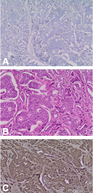 Hematoxylin and eosin stain of resected pancreatic mass pictured in Figure 1B. Staining: Positive for synaptophysin, chromogranin A (Figure 1C), CDX2, serotonin and negative for PAX8. | ||||||