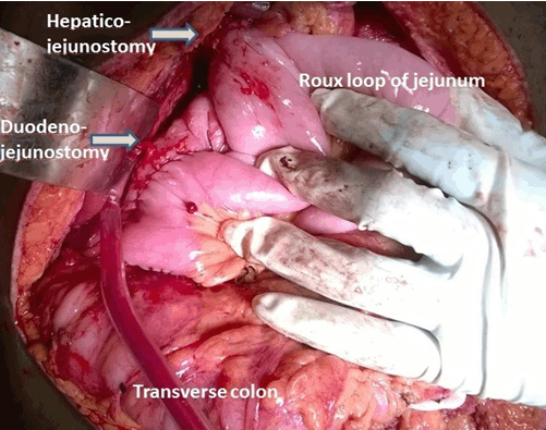 The hilar plate is lowered and hepatic ducts are defined. We prefer a 3cm long choledochotomy on the hilum extending to left or right duct. Following the successful clearance of stones from the biliary tree, a 55-cm-long Roux-en-Y loop is prepared and HJ constructed using interrupted 000 PDS (polydioxanone) sutures leaving a distal 15cm of the roux loop for subsequent anastomosis with the duodenum. After completion of HJ, the end of Roux loop is anastomosed with the first part of duodenum, in a side to side fashion using a single layer of interrupted 00 vicryl. Thus, the jejuno-duodenal anastomosis is constructed approximately 7–10 cm below the HJ (Figure 1), (Figure 2). We routinely advance the nasogastric tube into the second part of duodenum, and is removed on second post-operative day. A soft abdominal drain of 24Fr is placed in the morrison’s pouch.