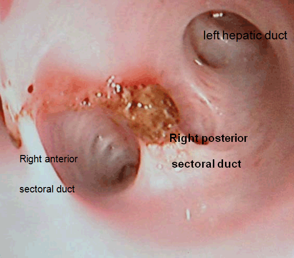 Methods: From August 2011 till December 2016, all patients treated for hepatolithiasis with bilateral disease, nondilated extrahepatic biliary system or extensive intrahepatic strictures underwent HJDA. After completion of hepaticojejunostomy (HJ), the free end of the Roux loop was anastomosed to the first part of duodenum in a side to side fashion. In the fourth week postoperatively, endoscopy with conventional forward viewing endoscope was performed to explore the possibility of accessing the biliary system.