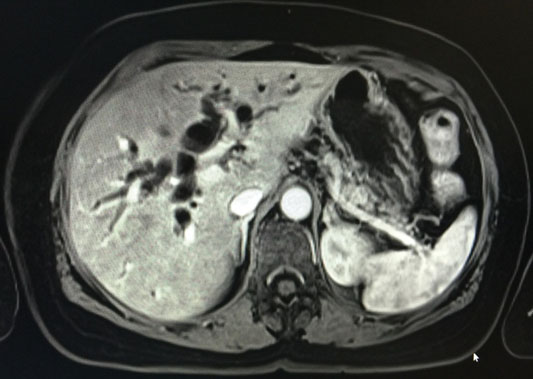 The patient was apparently well until three weeks prior to consult when she noticed tea-colored urine. One week later, she developed pruritus, acholic stools, and icteric sclerae. No weight loss or abdominal pain was noted as this time.