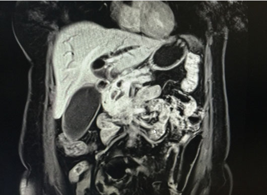 Chest X-ray, electrolytes and creatinine, liver function test, CA 19-9 levels were all normal. Esophagogastroduodenoscopy revealed no mass, polyps, or ulcers with the scope inserted up to the second part of the duodenum.