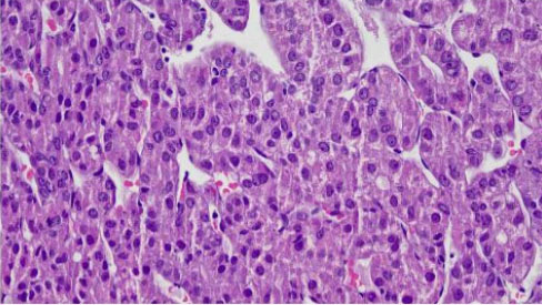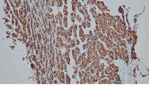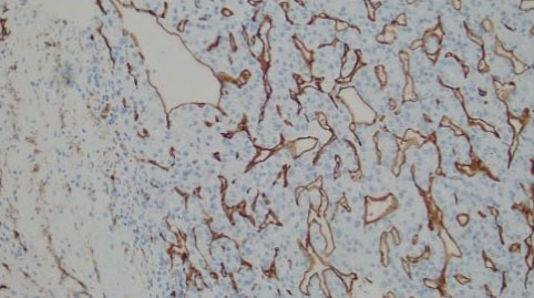 After discussion with the oncologist, a percutaneous biopsy of the right thigh mass was performed in July 2021. The histopathology examination (HPE) from the right thigh mass shows metastatic hepatocellular carcinoma. The malignant cells are positive for hepatocyte stain (Figure 1 and Figure 2). CD34 shows sinusoidal staining pattern (Figure 3 and Figure 4). His AFP at this time was 2.9 ng/mL. He was started on sorafenib but withheld in less than a month due to side effects of vomiting and diarrhea. Soon after discontinuation of the sorafenib he developed obstructive jaundice. Endoscopic retrograde cholangiopancreatography (ERCP) and stenting was done as a palliative intervention. The patient deteriorated and died within a month.