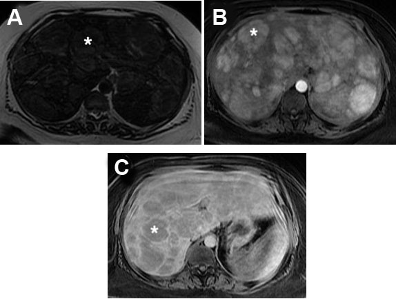 A 33-year-old black female with a past medical history of seizures, hypertension, type-2 diabetes, cognitive impairment, and neuropathy resulting in complete loss of ambulation was referred to our institution for radiologic evaluation following an abnormal liver function test (alkaline phosphatase (ALP) 1193; alanine transaminase/aspartate transaminase (ALT/AST) were normal at 16/16 U/L), microcytic anemia, and a vitamin B12 deficiency. No alcohol, drug, tobacco use, or family history of liver disease were noted. On physical exam, jaundice and abdominal pain were absent; chronic fatigue had been present for several months. Abdominal ultrasound (Figure 1A and Figure 1B) revealed hepatomegaly that exceeded 23 cm, with multiple heterogenous masses in both lobes of the liver hyperechoic to the surrounding parenchyma; further evaluation with contrast-enhanced CT (Figure 2A, Figure 2B, Figure 2C) revealed enhancement of approximately 100 lesions throughout both liver lobes, the largest measuring 5–6 cm. The liver parenchyma had a uniform density without pathologic enhancement and a normal gallbladder without evidence of biliary dilation. Magnetic resonance imaging (MRI) (Figure 3A, Figure 3B, Figure 3C) shows numerous T2 hyperintense hepatic lesions, which enhanced during the arterial phase with intravenous (IV) gadolinium. To rule out a hyper-vascular primary malignancy or vascular metastasis, a CT-guided percutaneous biopsy of the liver was performed. Pathology identified mild macro-vesicular steatosis and marked sinusoidal dilation (Figure 4A, Figure 4B, Figure 4C), consistent with peliosis hepatis and mild macro-vesicular steatosis of the liver. Occult bleeding of the upper and lower gastrointestinal tract (GI) tract was ruled out; the anemia was treated with Vitamin B12 injections and IV iron transfusions. After two years of follow-up, the anemia persisted; testing revealed alfa-thalassemia minor. Radiographic follow-ups noted stable lesions; the patient has remained asymptomatic three-years post-diagnosis. Interestingly, however, the patient’s lab values have continued to show elevated ALP levels that vary between 1200 and 1700 IU/L, while the ALT/AST values have remained normal.