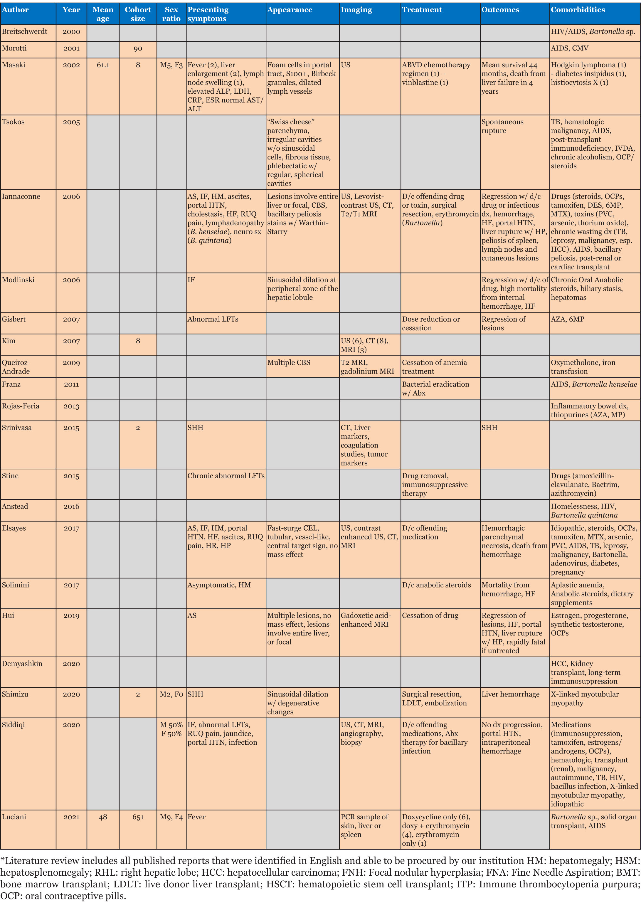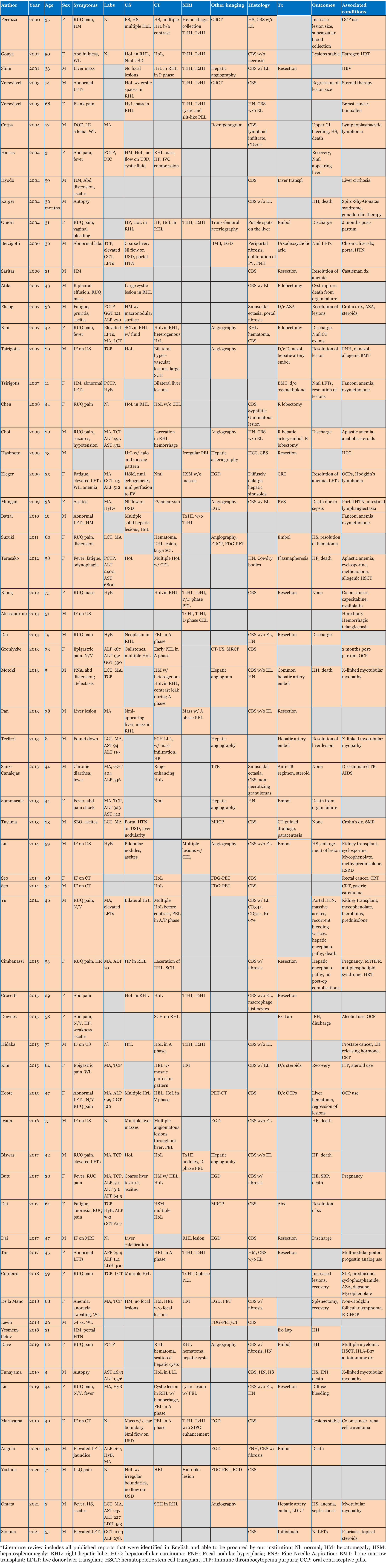 Currently, there is no specific treatment for PH, and lesions have been reported to spontaneously resolve without clinical consequence (7.9%; n=5) [4],[13],[23],[29]; specifically, drug/toxicity-related cases (7.9%; n=5) often resolve with withdrawal of the offending drug/toxin with normalization of lab values. Peliosis hepatis lesions due to Bartonella may regress with antibiotics, such as Doxycycline or Erythromycin; however, bacillary peliosis cases were not identified in the literature [45]. Typically, however, progression to portal hypertension and liver failure occurs when PH remains untreated (22%; n=14) [1],[4],[6],[13],[29] with ascites (58.3%; n=7), portal hypertension (25%; n=3), liver failure (25%; n=3), and encephalopathy (8.3%; n=1) reported; mortality due to long-term complications of hepatic failure was also noted (16.7%; n=2).